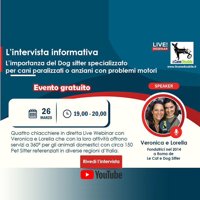 Un pacchetto di due serate in modalità Live Webinar in cui illustreremo i benefici dei metodi naturali con particolari approfondimenti sulle problematiche più comuni nei cani paralizzati, con la partecipazione di una Professionista Naturopata ad indirizzo animale.