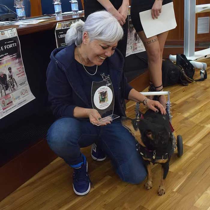 “Eliana Martorano, grazie alla tua disponibilità e ai tuoi preziosissimi consigli ho imparato che gestire un cane disabile, per quanto impegnativo, è un compito meno gravoso di quanto temessi. Non finirò mai di ringraziarti… e anche Brodo ringrazia!!”